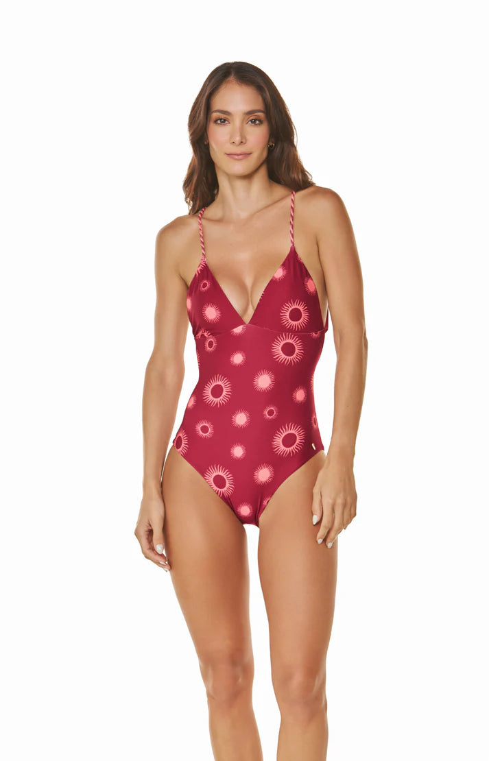 Este vestido de baño entero vinotinto estampado con soles combina elegancia y comodidad. Diseñado con un escote profundo y copas... Leer más...