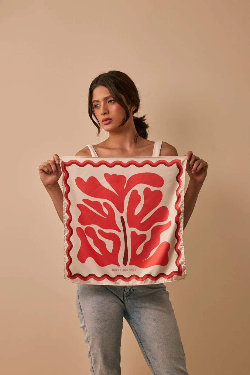 Pañoleta en seda, estampada con ilustración original en colores crudo y rojo, inspirada en los corales y sus formas. Producto... Leer más...