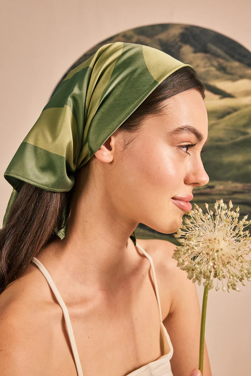 Pañoleta en seda, estampada con ilustración original geométrica en tonos verdes. Producto 100% hecho en Cali, Colombia. Leer más...