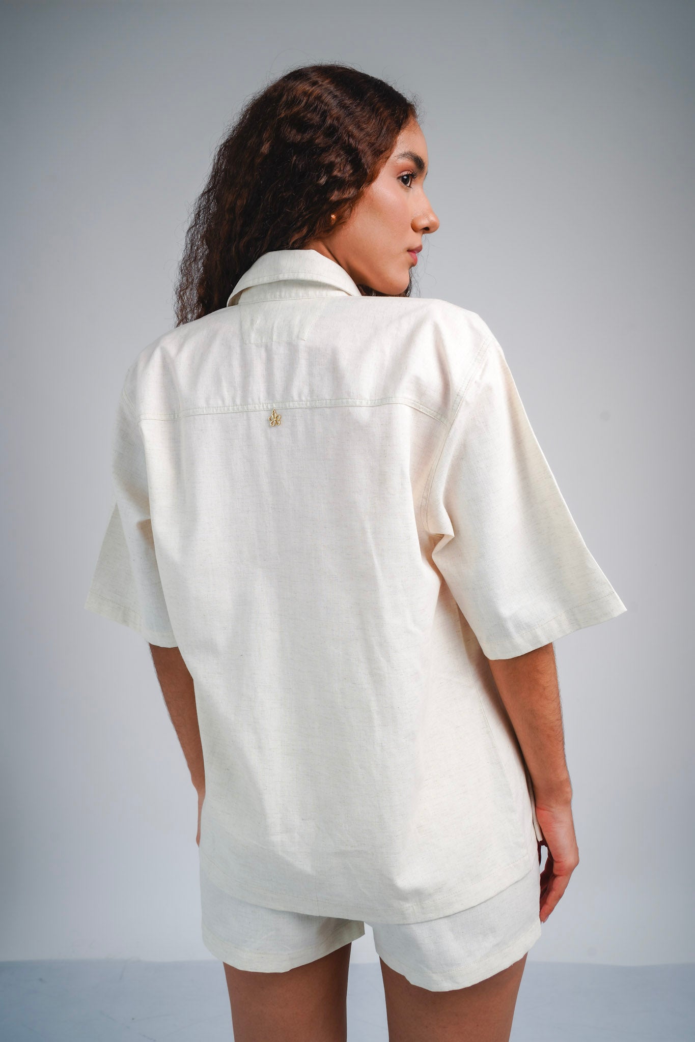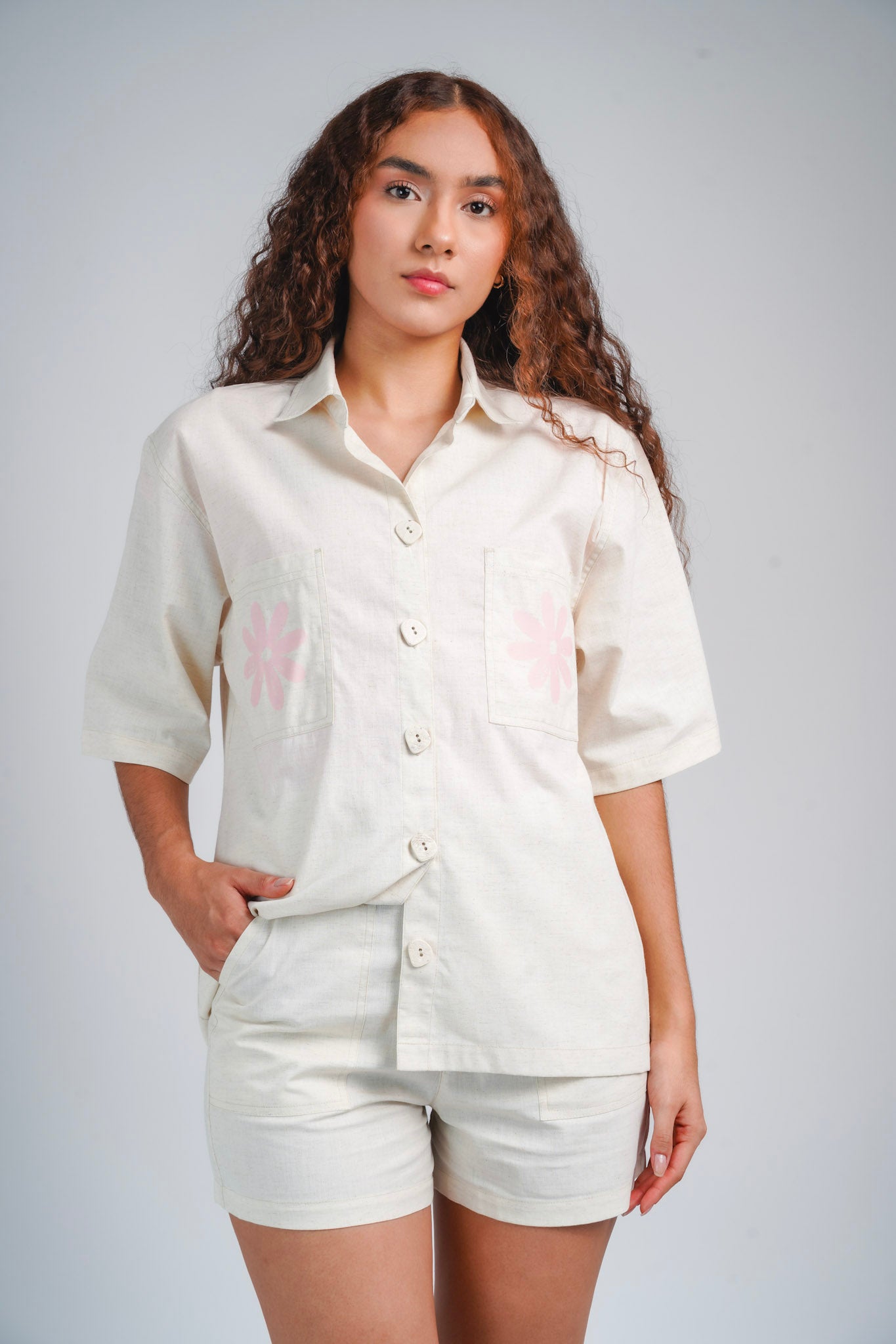 Set street color natural incluye short y camisa de manga corta. La camisa presenta un diseño relajado con botones al... Leer más...