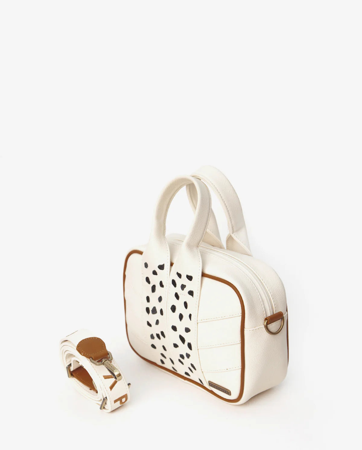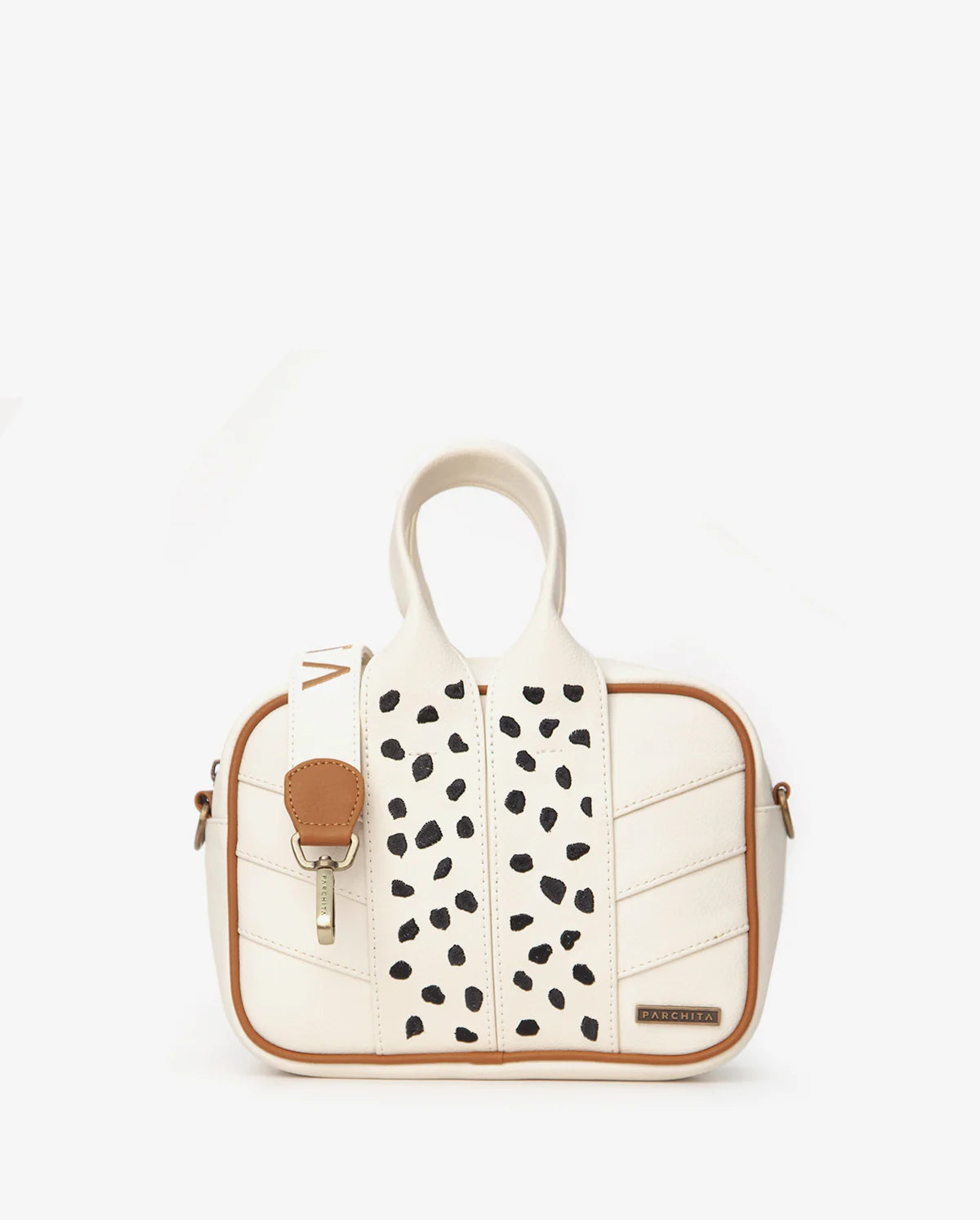 Es una bandolera pequeña y funcional, que cuenta con dos asas en pvc bordadas con manchas en contraste, strap removible... Leer más...